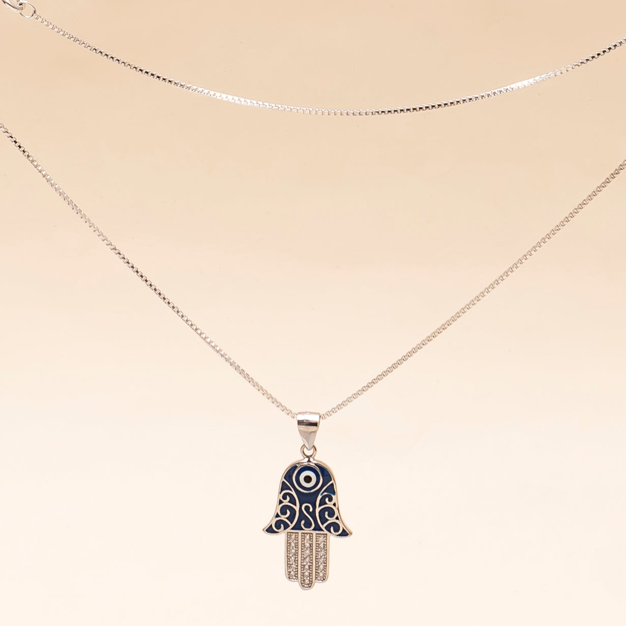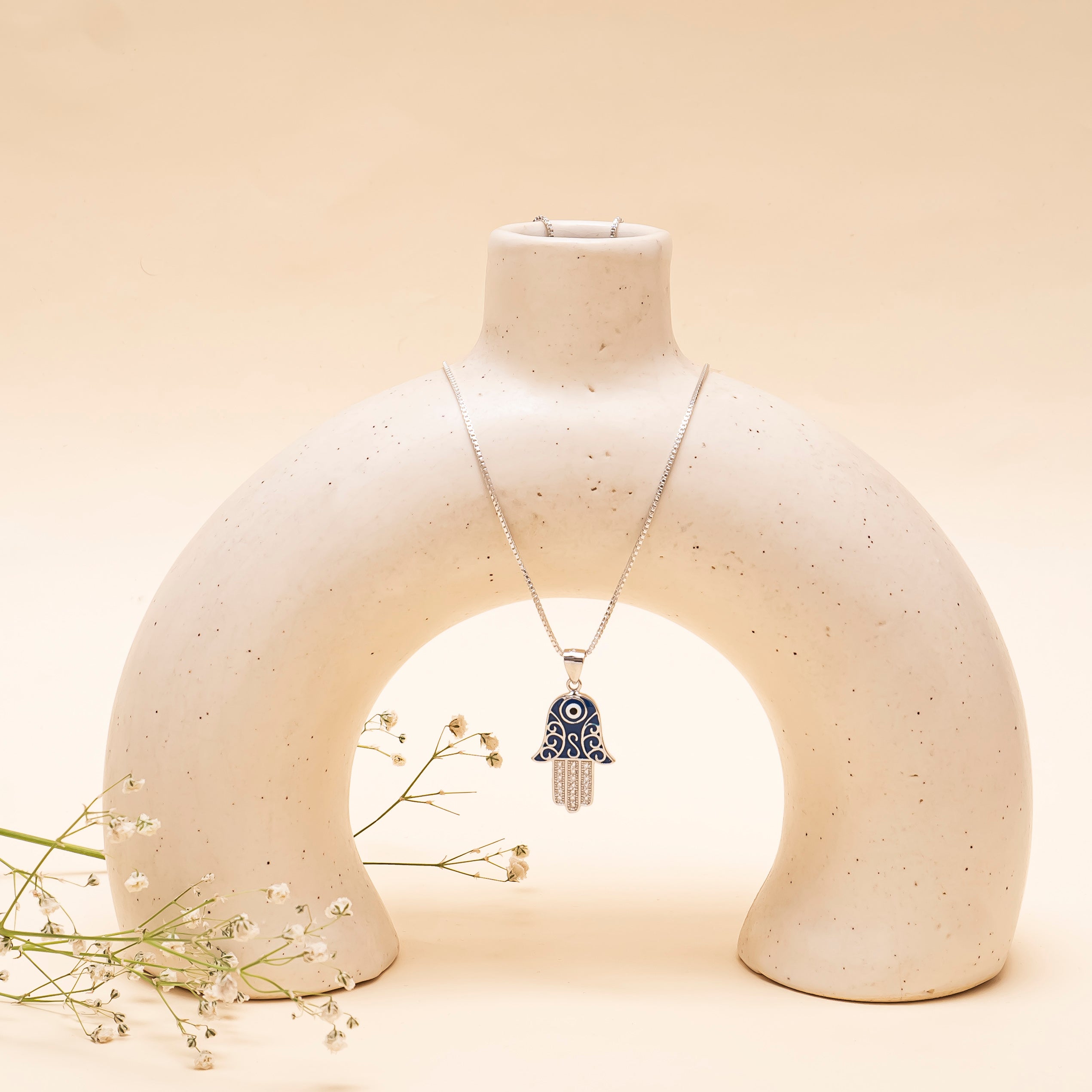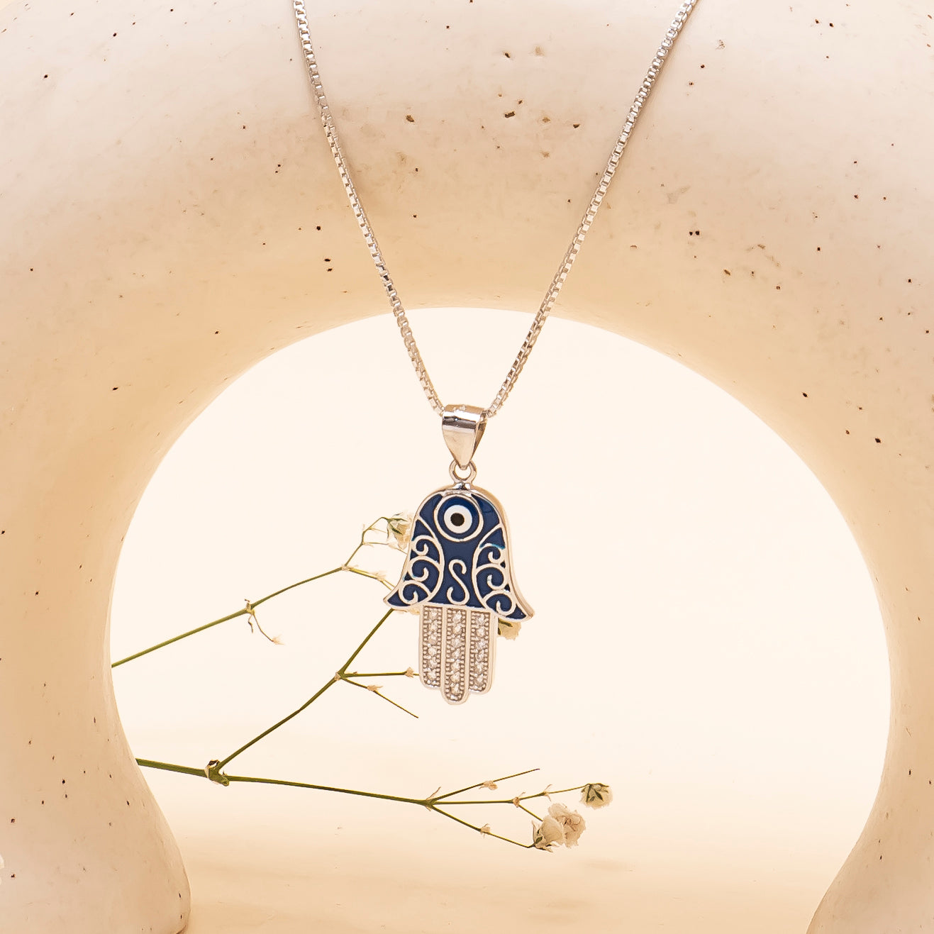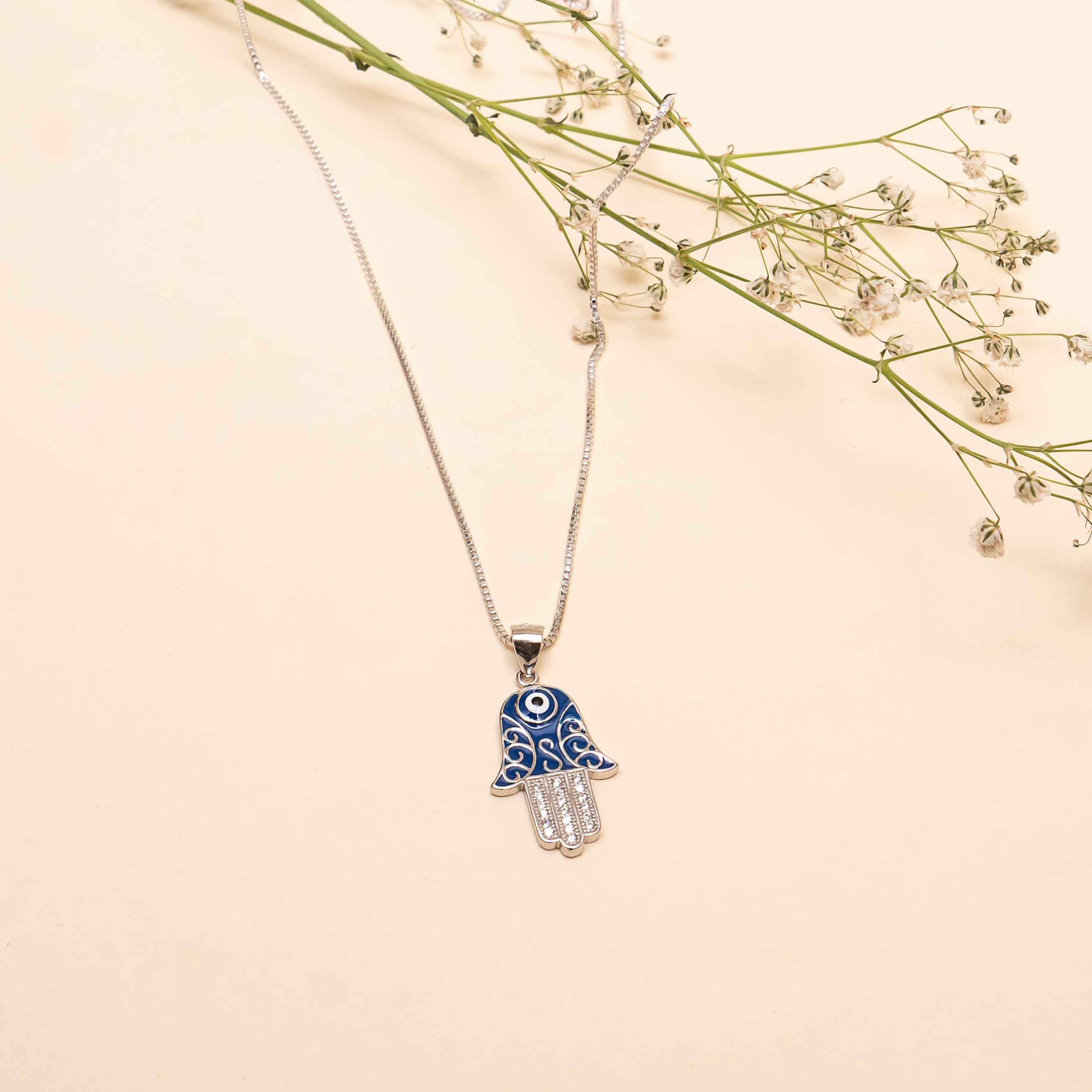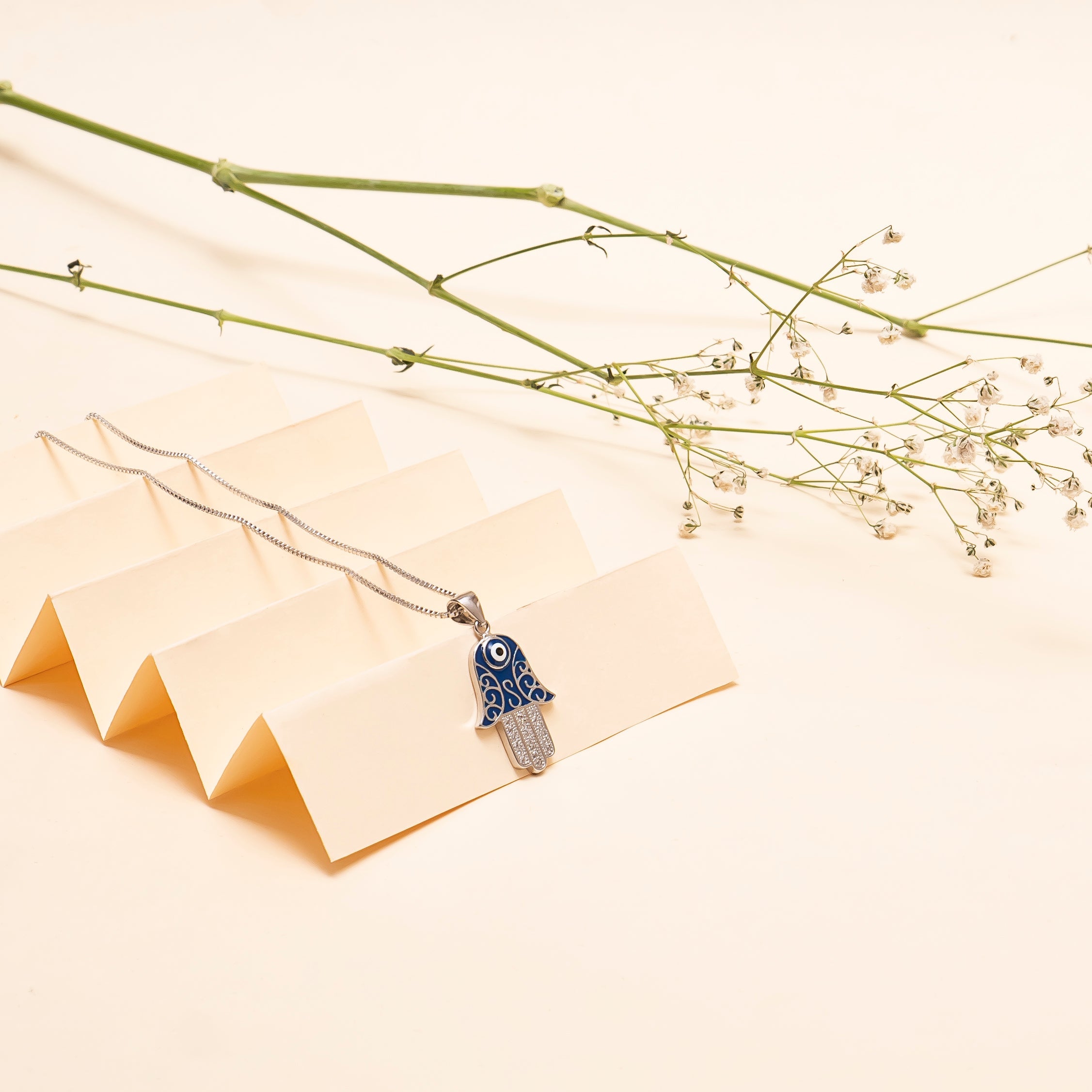 Product Details:This 925 Silver Evil Eye Hamsa Hand Pendant blends ancient symbolism with modern elegance. It showcases the protective Hamsa hand with an evil eye at its center, symbolizing protection and good fortune. The intricate scrollwork and shimmering stones add a refined touch to this meaningful piece. Perfect for spiritual occasions, daily wear, or as a thoughtful gift for a loved one.