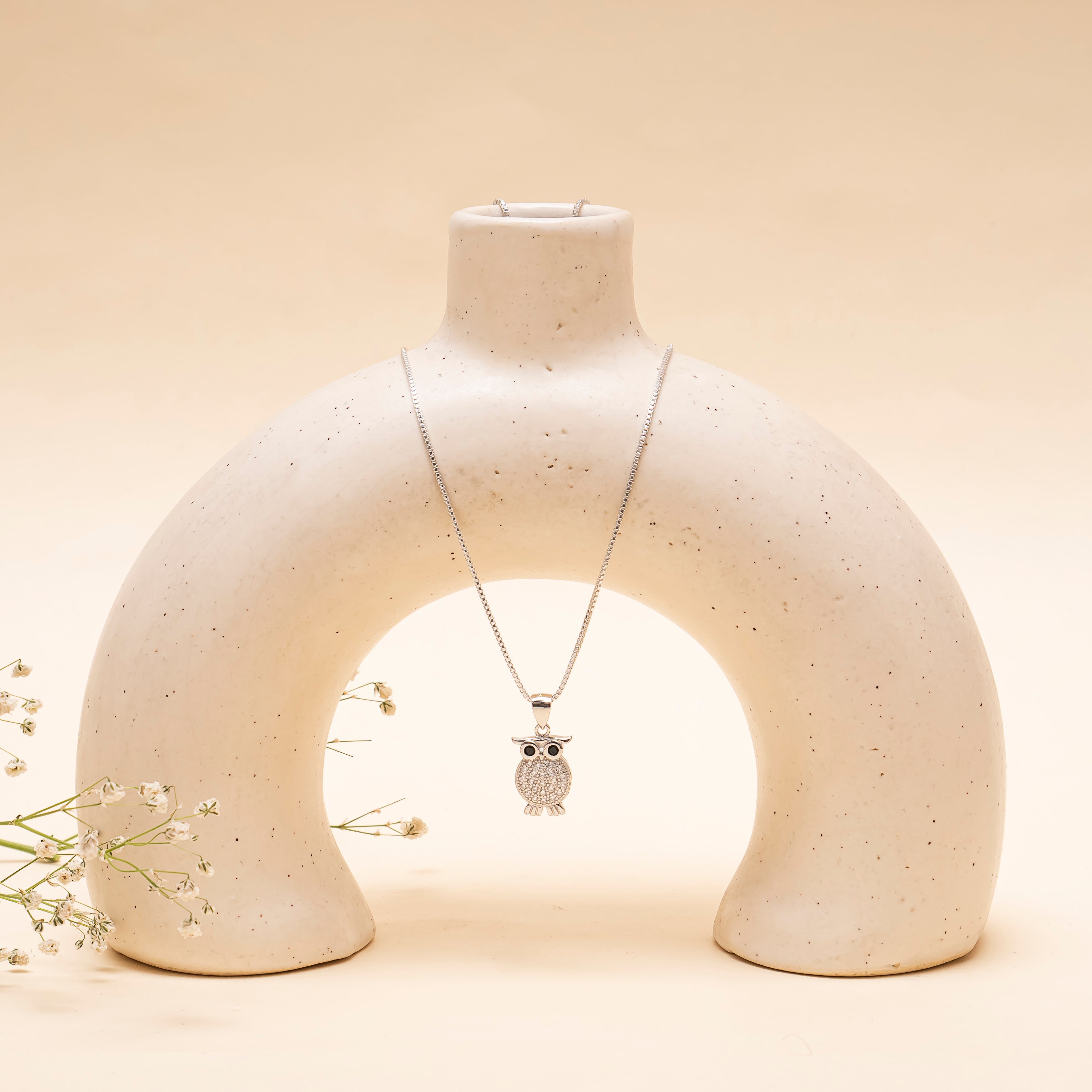 Design:A detailed owl-shaped pendant with a textured, stone-studded body and bold eyes for a whimsical yet elegant look.
