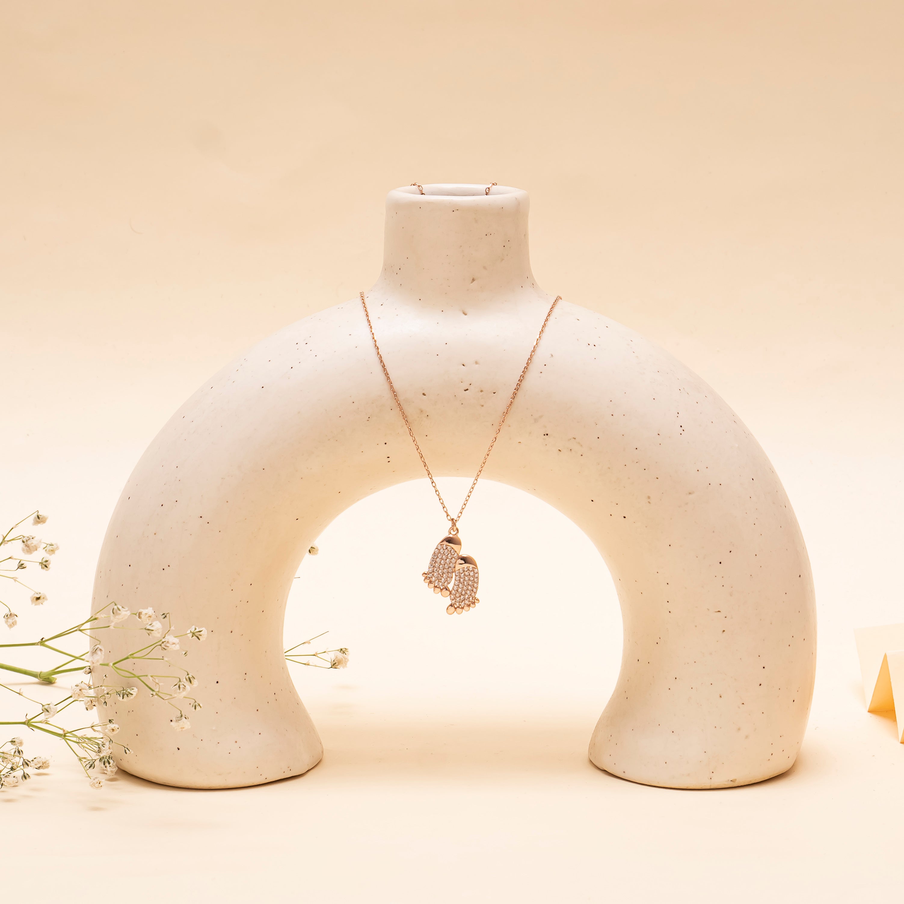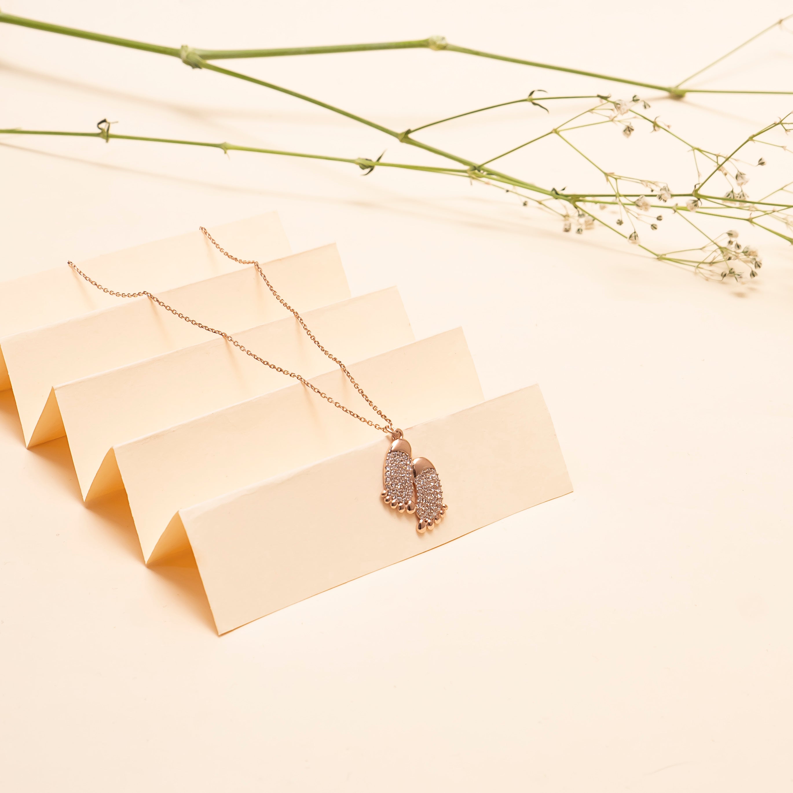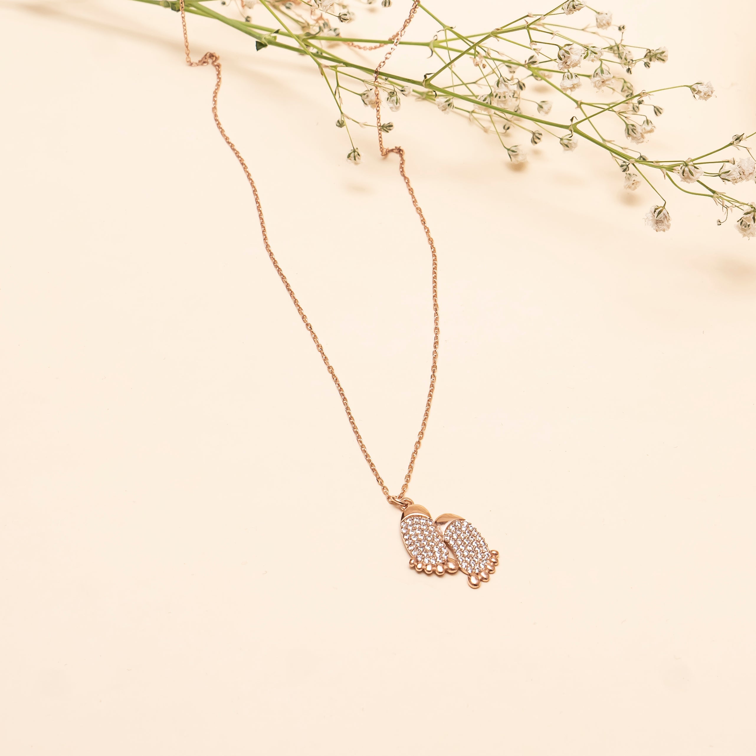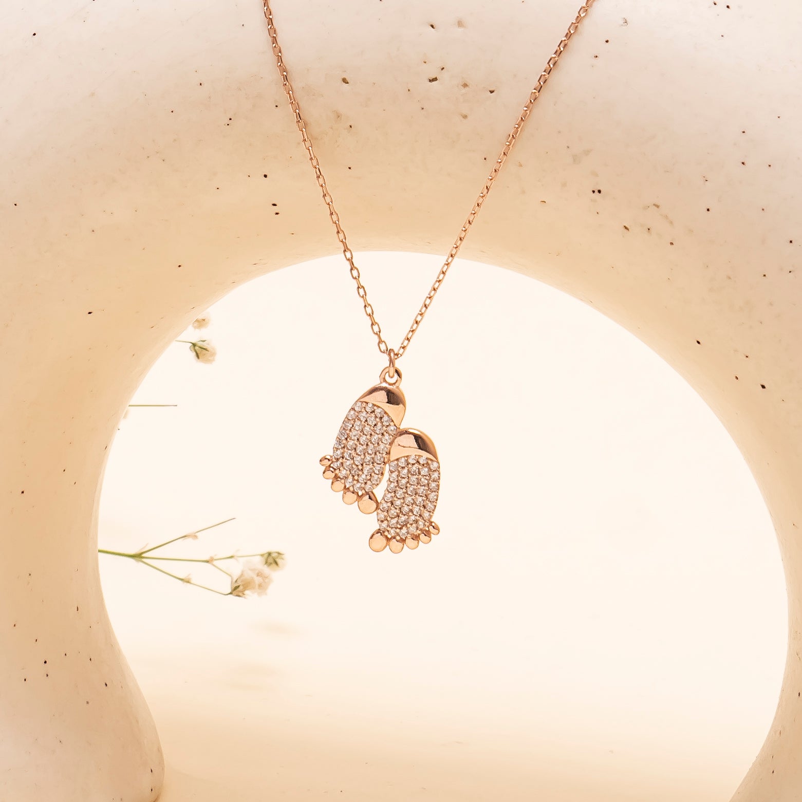 Product Details:This Baby Feet Necklace in 925 Silver is a sweet and sentimental piece that captures the joy of new beginnings. It features a delicate pendant shaped like tiny baby feet, encrusted with shimmering zircon stones for added elegance. Suspended on a fine rose gold-toned chain, it's both heartwarming and stylish. A perfect gift for baby showers, new moms, or commemorating the birth of a child.