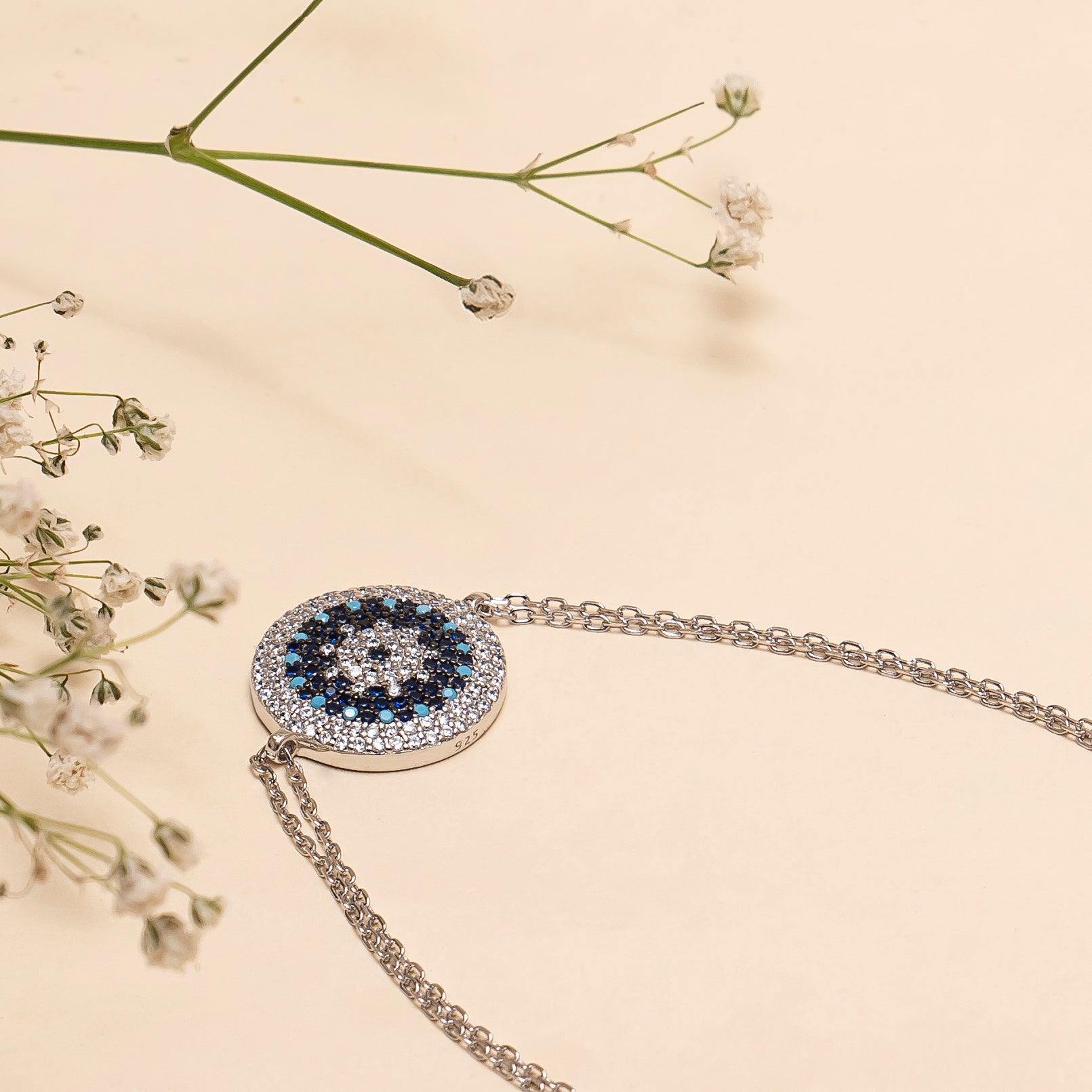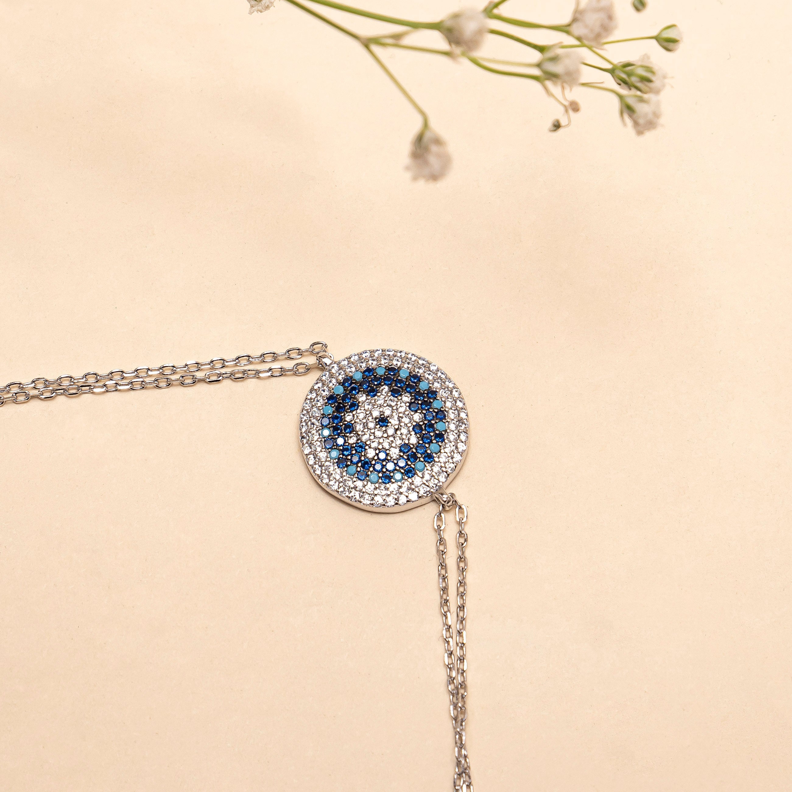Design:Circular evil eye motif detailed with tiny glittering stones on a fine silver chain.