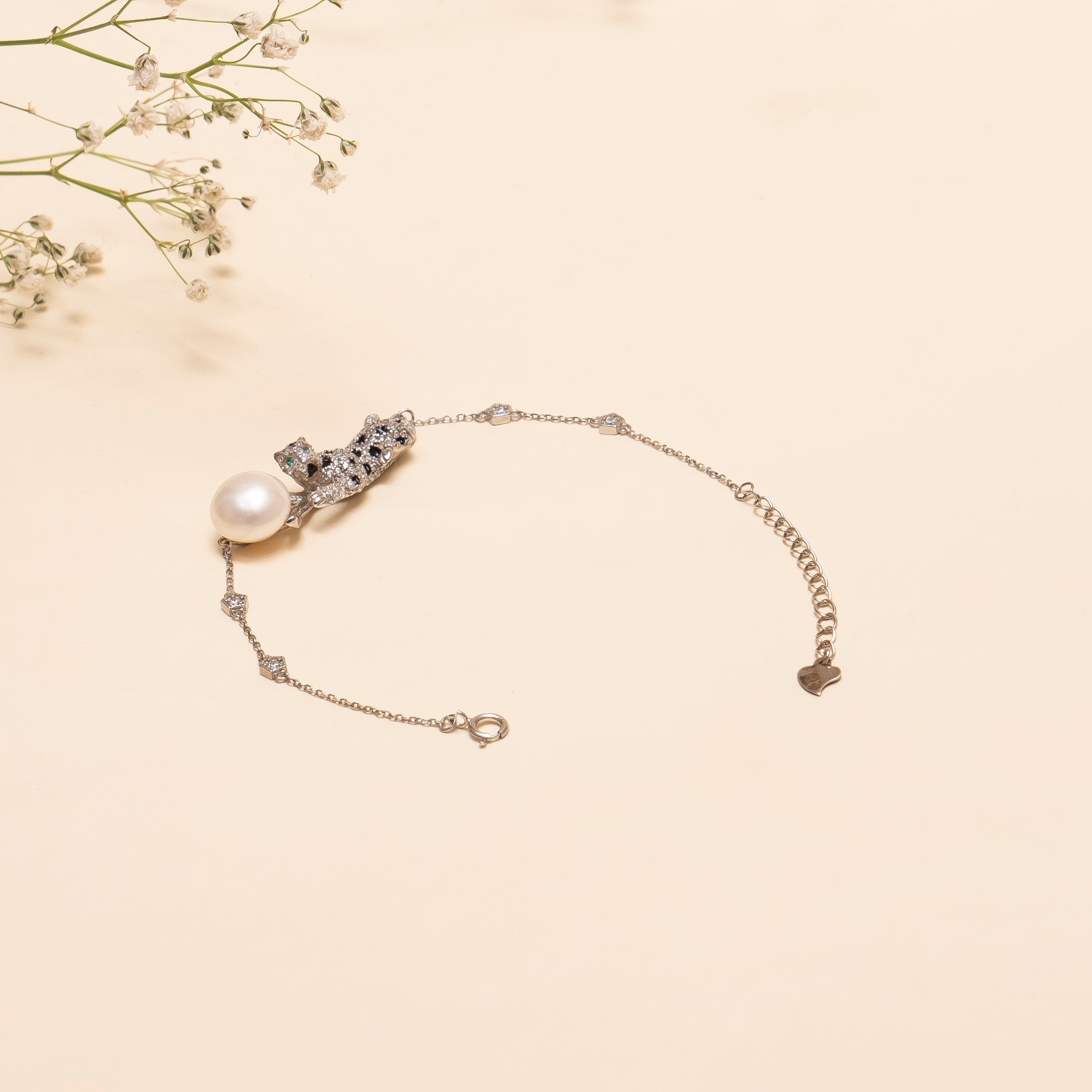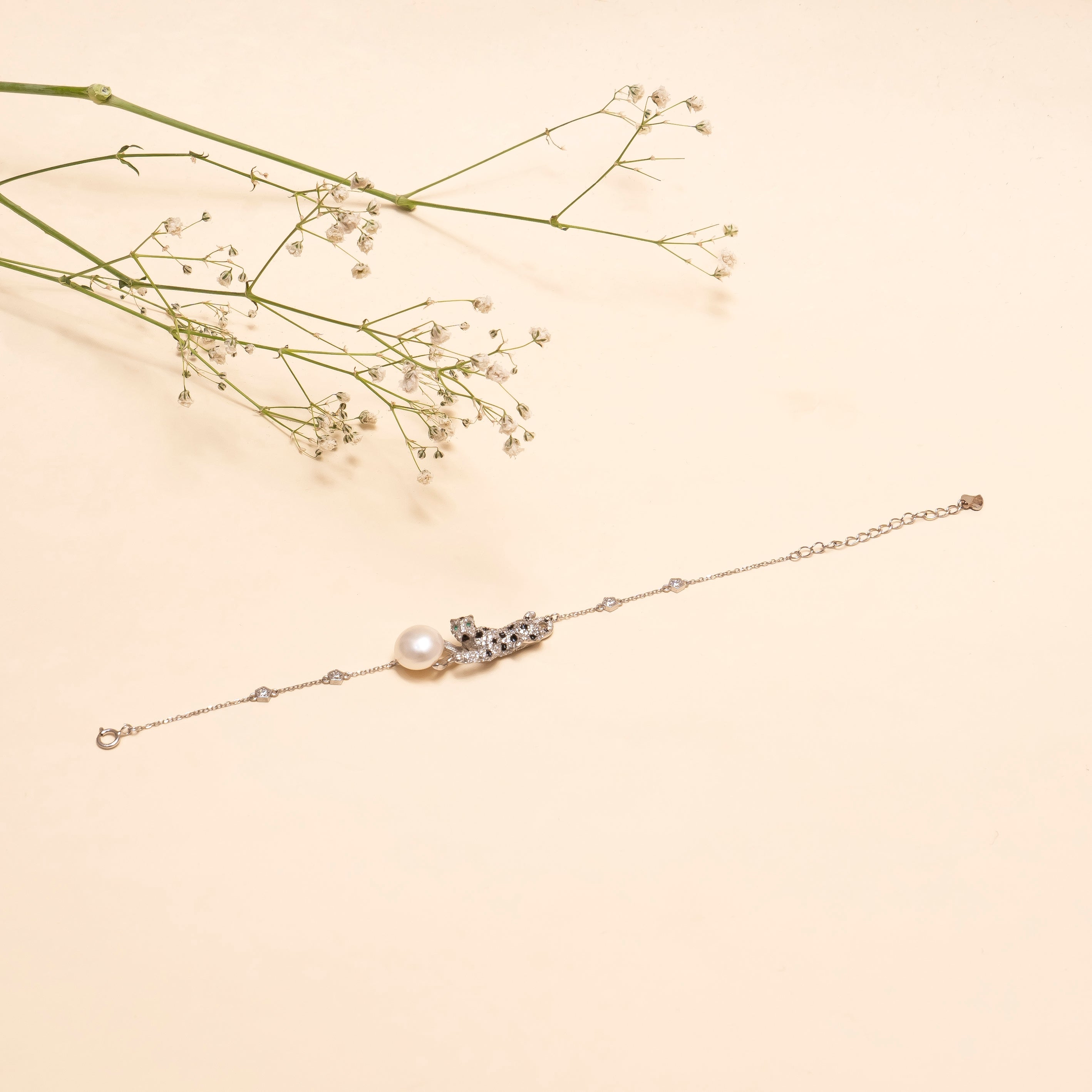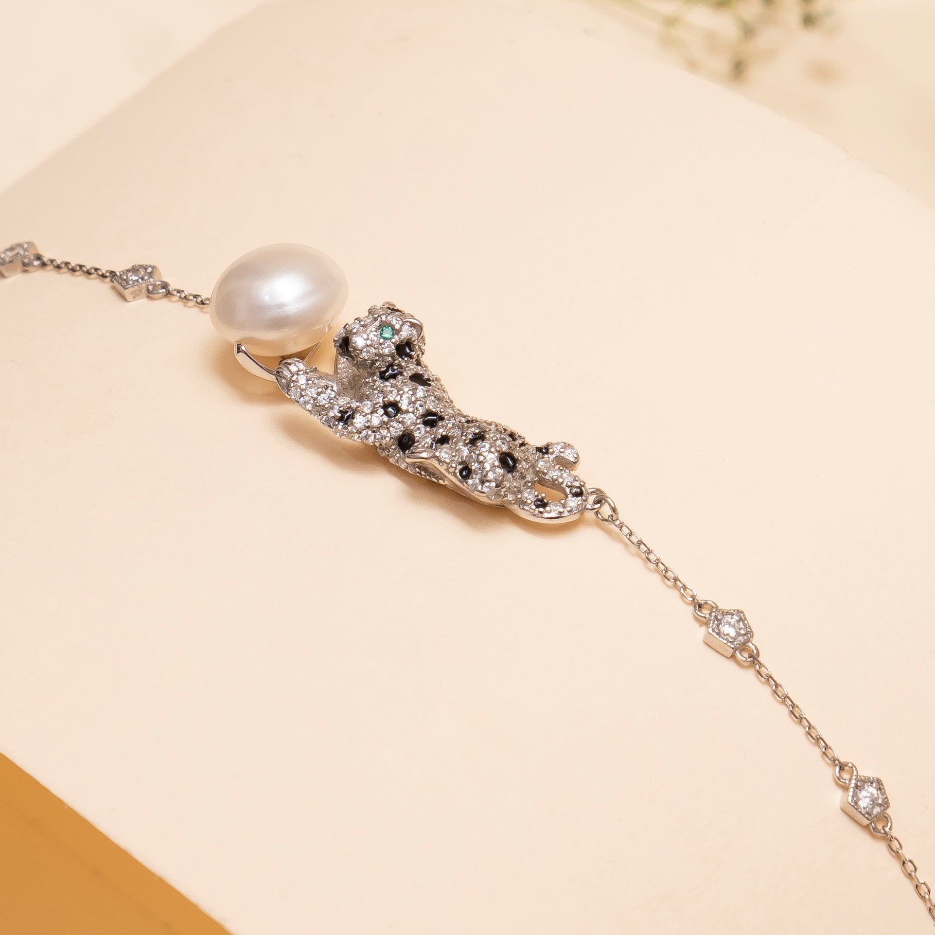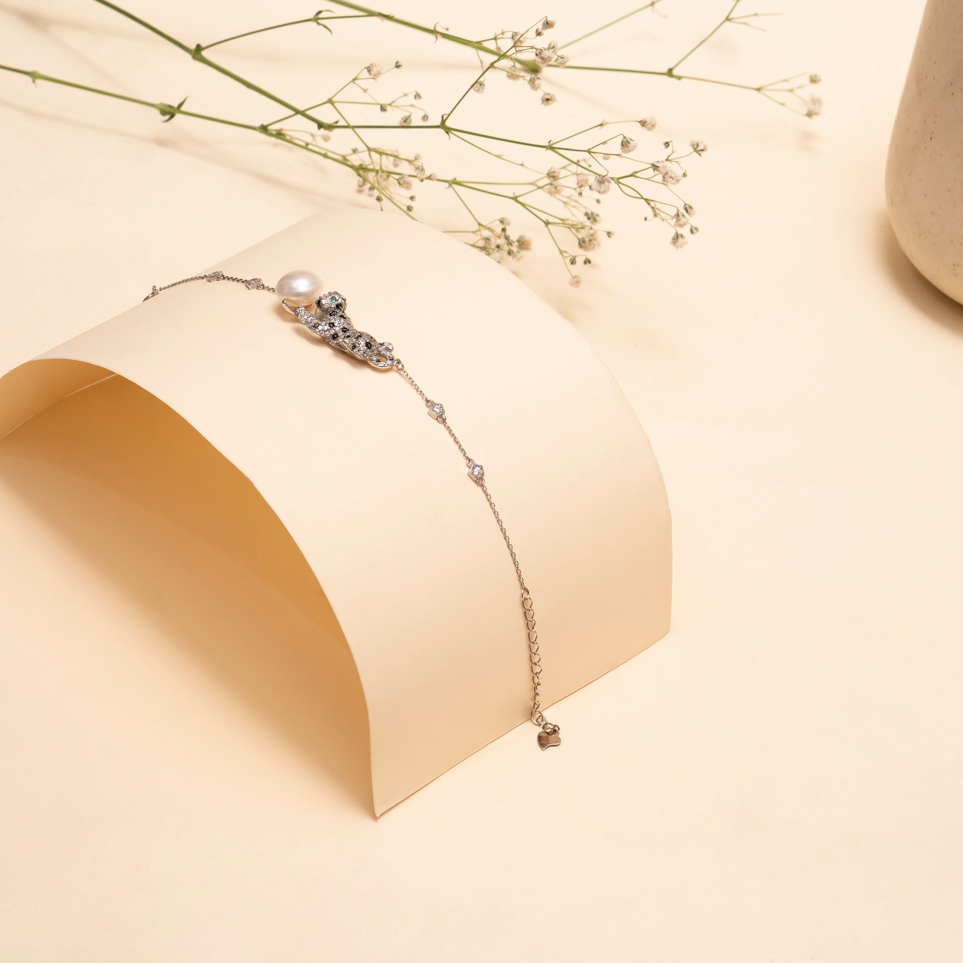 Design:It showcases a panther motif adorned with fine stones and an elegant large pearl, finished with a delicate silver chain.