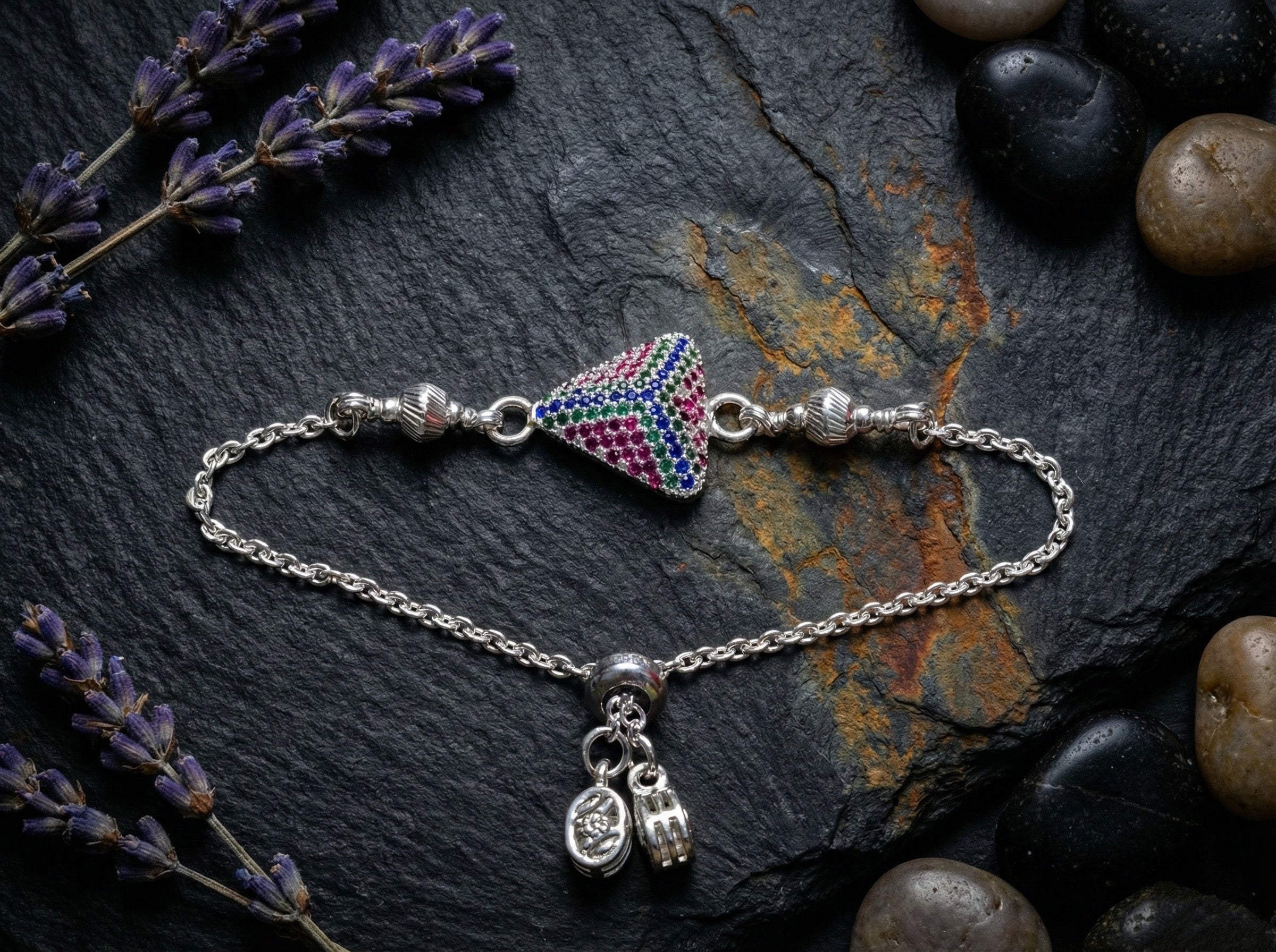 Infuse your jewelry collection with a splash of playful elegance. This contemporary bracelet features a striking triangular centerpiece, meticulously pave-set with a vibrant mosaic of pink, emerald-green, and sapphire-blue stones. The geometric design offers a modern twist on traditional silver jewelry, making it a standout accessory for any outfit.